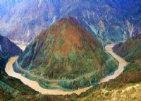 金沙江第一灣位于云南省迪慶州德欽縣奔子欄鎮(zhèn)和四川省得榮縣子庚鄉(xiāng)交界處,當?shù)厝朔Q為月亮灣。由北向南縱貫全境的定曲河,在先后接納了瑪伊河和碩曲河之后,攜三江之水投入了金沙江的懷抱,在江水匯合處,形成“三壁夾兩江”的奇景。穿山越谷而來的金沙江,由此水勢更加浩蕩,峽谷逐漸開闊,在即將沖出這川滇要塞之時,它似乎想先舒緩一下長途奔波的疲勞,于是放慢腳步,圍繞著金字塔般的日錐峰瀟灑地畫了一個“Ω”字形的大拐彎。孰料這不經(jīng)意的即興之作,竟成就了一處奇觀,這就是國內四十大景觀之一的“金沙江第一灣”。從山頂俯瞰全景,使人在心曠神怡、蕩氣回腸之際,不能不驚嘆自然造化的神奇!