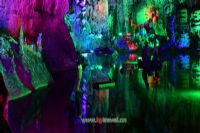 此洞分上、中、下三層,總高差88.4米,為天然彩色石洞,上層為淡紅色,下層為淡綠色,中層為淡黃色,洞內詭奇多端,神秘莫測,先要半臥半蹲才能進洞,走上一段路后,豁然開朗,面前呈現一個寬敞的大廳,再進時聞流水沽沽有聲,原來是一條暗河,沿河行走,鐘乳石形成欄桿,欄桿上各種奇形怪狀的圖象,儀態萬千,晶瑩奪目,走在當中若置身神話世界,讓人浮想連翩。陰河盡頭有一“高山”在洞內拔地而起,山頂上端坐著一位維妙維肖的彌勒佛,若不仔細端詳會以為出自雕塑家之手筆,更為奇特的是從:“山”腳至“山”頂,有許多人形石頭,躬身曲背正在登山,有的背上背著東西,有的頭上戴著帽子,還有一位婦女手中牽著孩子仿佛是去朝拜,形象生動,呼之欲出,參觀者嘆為觀止。繞過“山”去,一片石林從人們面前延伸開去,粗細不一的石柱密密麻麻,盤根錯節,仿佛進入熱帶雨林,人們只有側身滑過,林內有幾條小溪曲曲折折地潛入暗河中,水鳴之聲如環佩叮當作響,十分悅耳。